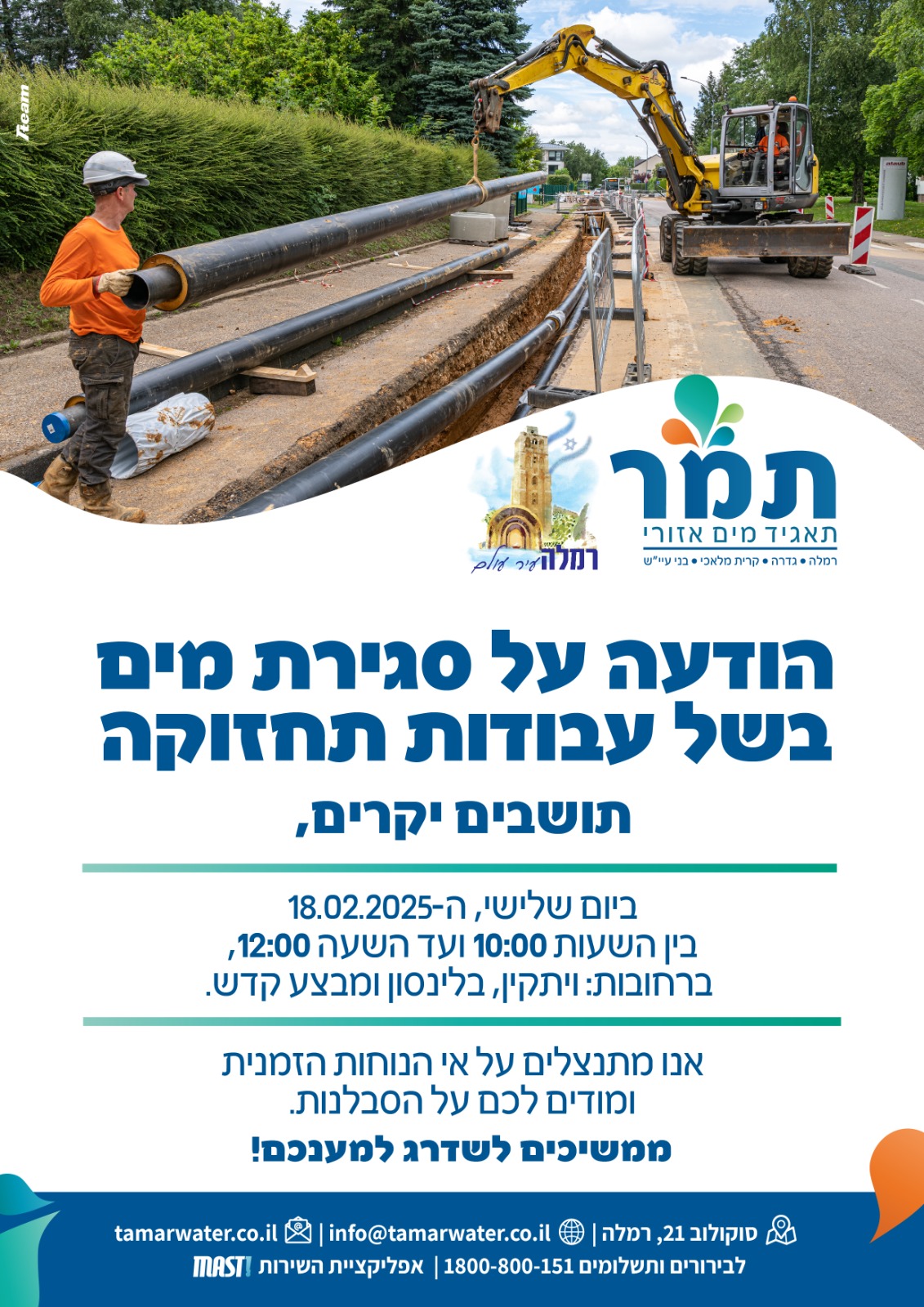 הודעה על סגירת מים בשל עבודות תחזוקה, רחובות ויתקין, בלינסון, ומבצע קדש, 18.02.2025