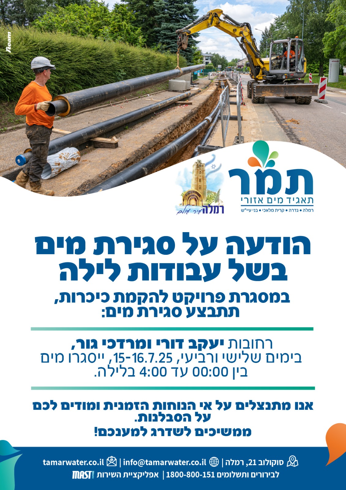 הודעה על הפסקת מים ברחובות יעקב דורי ומרדכי גור בתאריך 15-16.7.2025