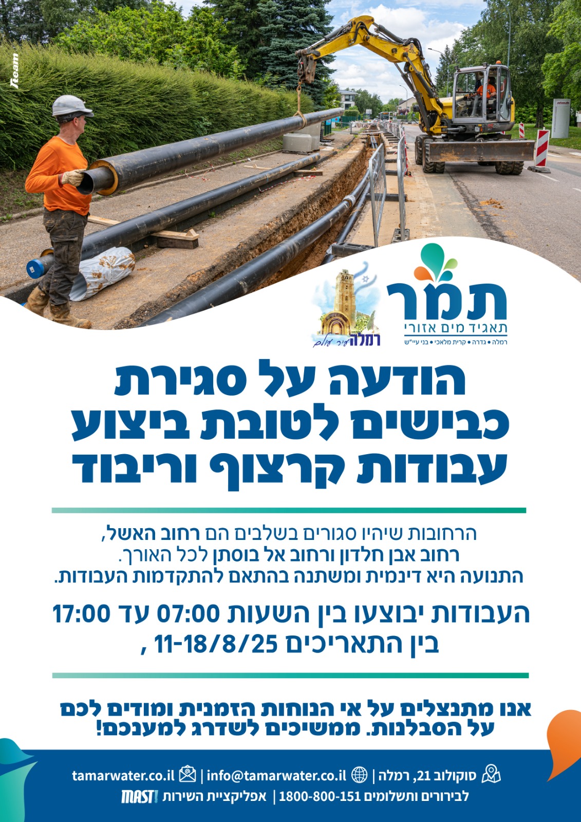 הודעה על סגירת כבישים לטובת עבודות קרצוף וריבוד